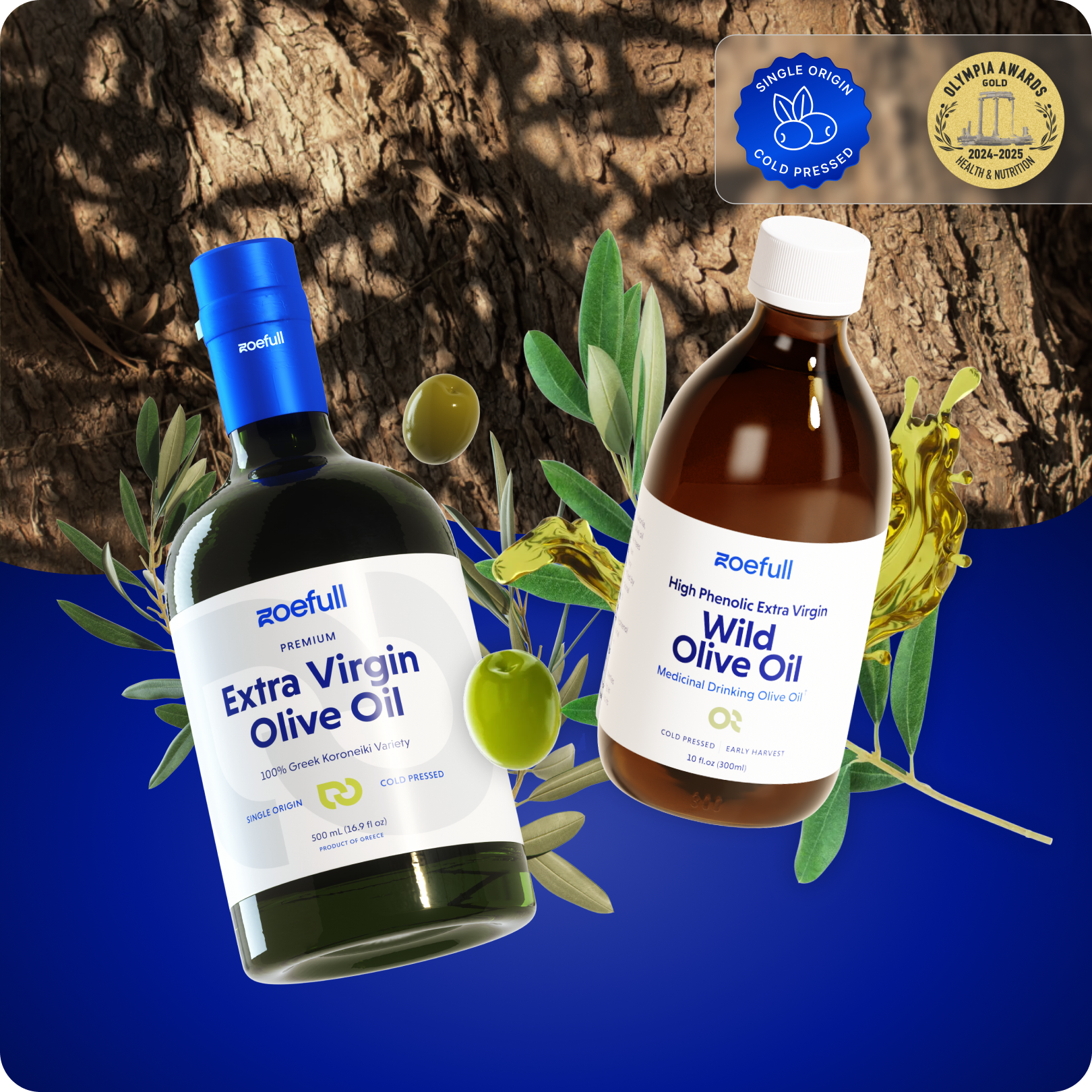 a concentrated Wild Olive Oil shot in the morning, and a high-phenolic Extra Virgin Olive Oil used generously in your food throughout the day.