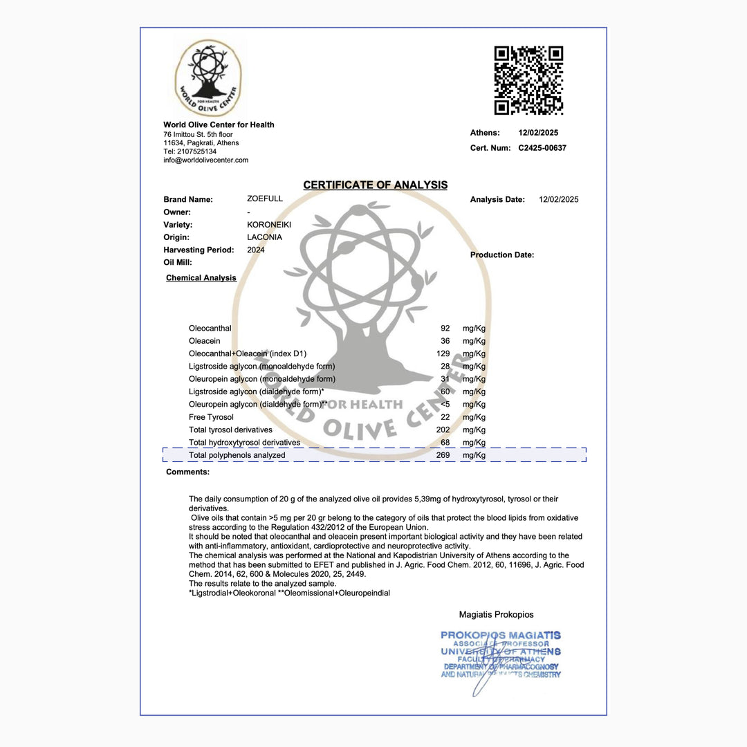 An authentic Greek extra virgin olive oil made from hand-harvested Koroneiki olives, naturally rich in anti-inflammatory polyphenols and cold-pressed for full flavor and health benefits. Crafted for everyday use — this is the olive oil you pour, cook with, and finish your meals with, while still nourishing your gut, heart, and metabolism.